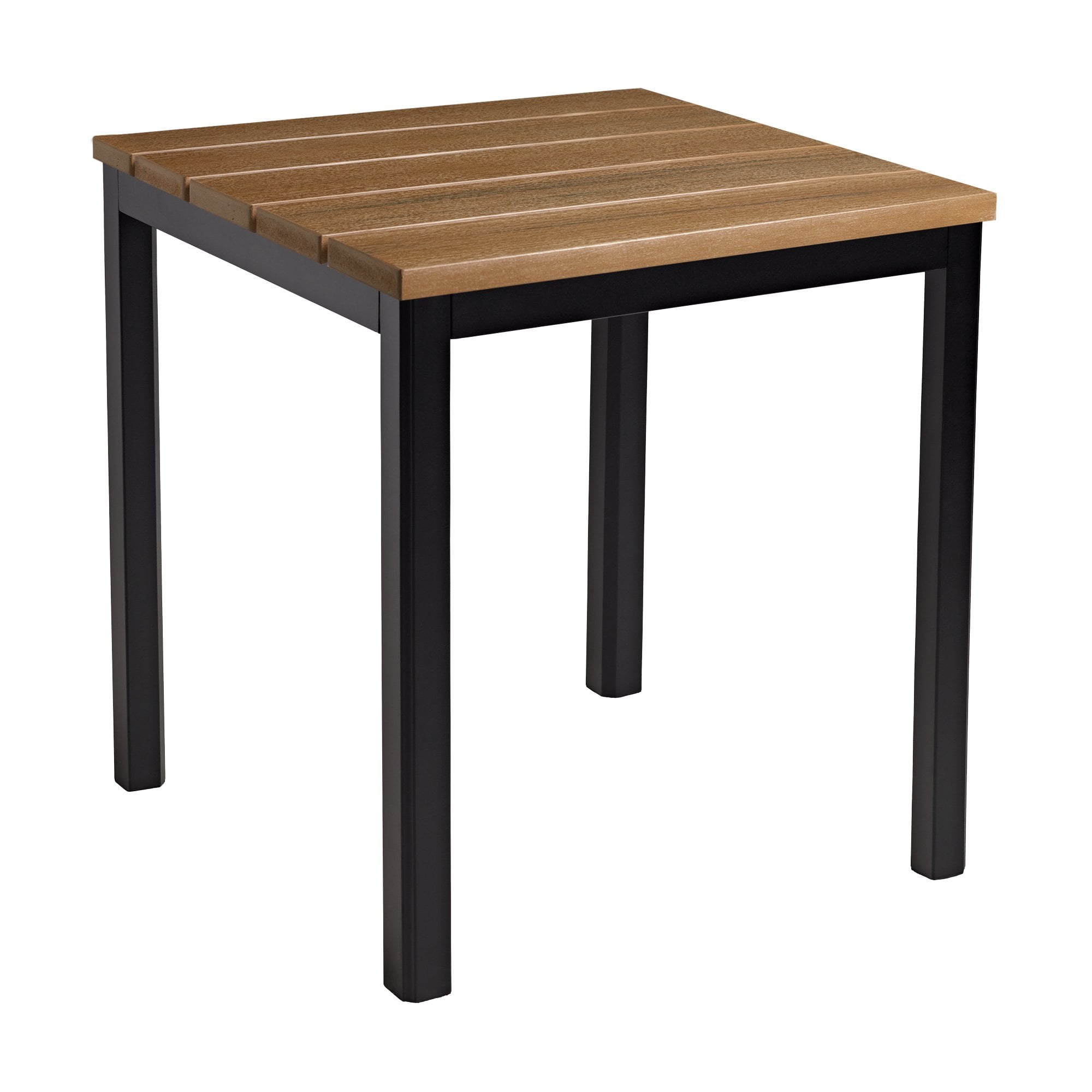 The square EKO dining height table is a modern and durable choice for any indoor or outdoor hospitality space. Its Aged Golden Oak Top EKO tabletop offers the aesthetic of wood but is crafted from 100% recycled materials, providing a maintenance-free, weather, fade, and UV-resistant surface that never needs painting. Paired with the robust, black powder-coated steel Troy Table Base featuring adjustable feet for exceptional stability, this table is built to last.