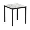 The dining table features an Extrema Mixed Terrazzo top that's built to last, withstanding weather, impacts, abrasions, heat, and stains with virtually no maintenance. It also resists UV fading. The Paris Table Base, made from durable black powder-coated steel with adjustable feet for stability, ensures this stylish commercial table is a low-maintenance, long-lasting choice for any indoor or outdoor hospitality setting.
